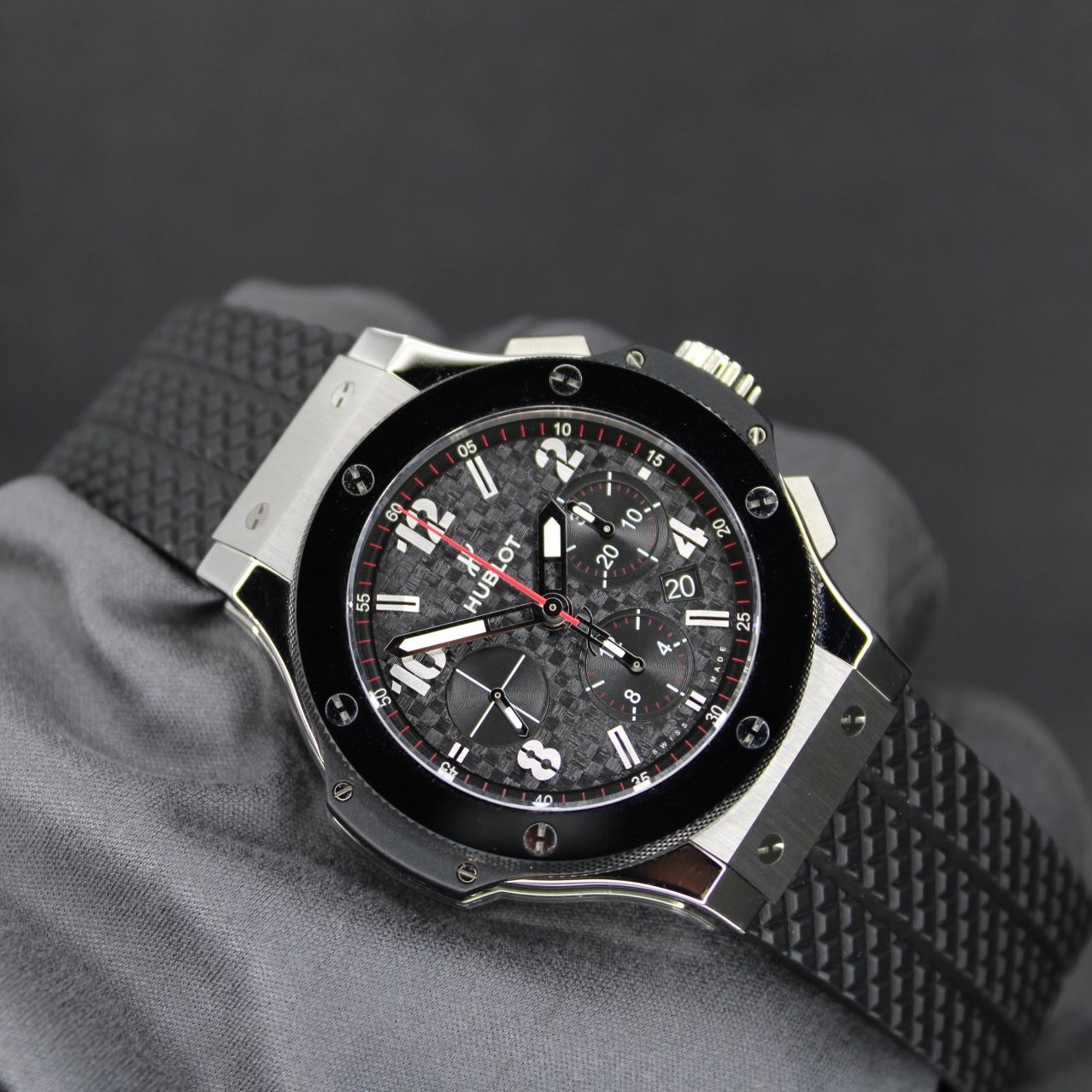 Hublot Big Bang Original Steel Ceramic 301.SB.131.RX — a bold declaration of style and performance. Its 44 mm polished and satin-finished stainless-steel case paired with a sleek black ceramic bezel gives it a powerful, contemporary presence. The carbon-effect dial, black structured rubber strap, and red-accented chronograph hands deliver a sporty, high-tech aesthetic — classic “Art of Fusion” energy. Inside beats the self-winding HUB4100 chronograph movement with a 42-hour power reserve, while sapphire crystal (front and back) protects the watch and offers a peek at its mechanical heart. With water-resistance up to 100 m and its blend of robust materials and bold design, the 301.SB.131.RX is perfect for those who want a luxury watch that doesn’t shy away from attitude or performance.