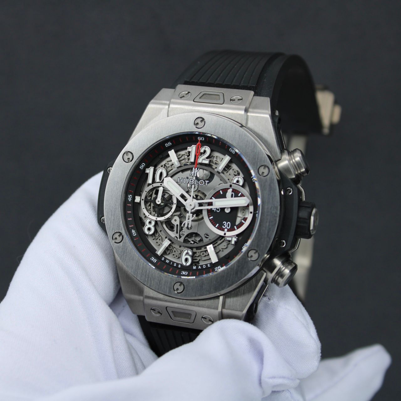 The Hublot Big Bang Unico reference 411.NX.1170.RX is a striking expression of modern watchmaking and bold design. Featuring a 45 mm titanium case with Hublot’s signature layered construction, it showcases a skeletonized dial that reveals the in-house Unico automatic chronograph movement with a column wheel visible on the dial side. Paired with a black structured rubber strap, this timepiece delivers a powerful sporty presence while maintaining everyday wearability. It perfectly reflects the innovative, avant-garde spirit that defines Hublot.