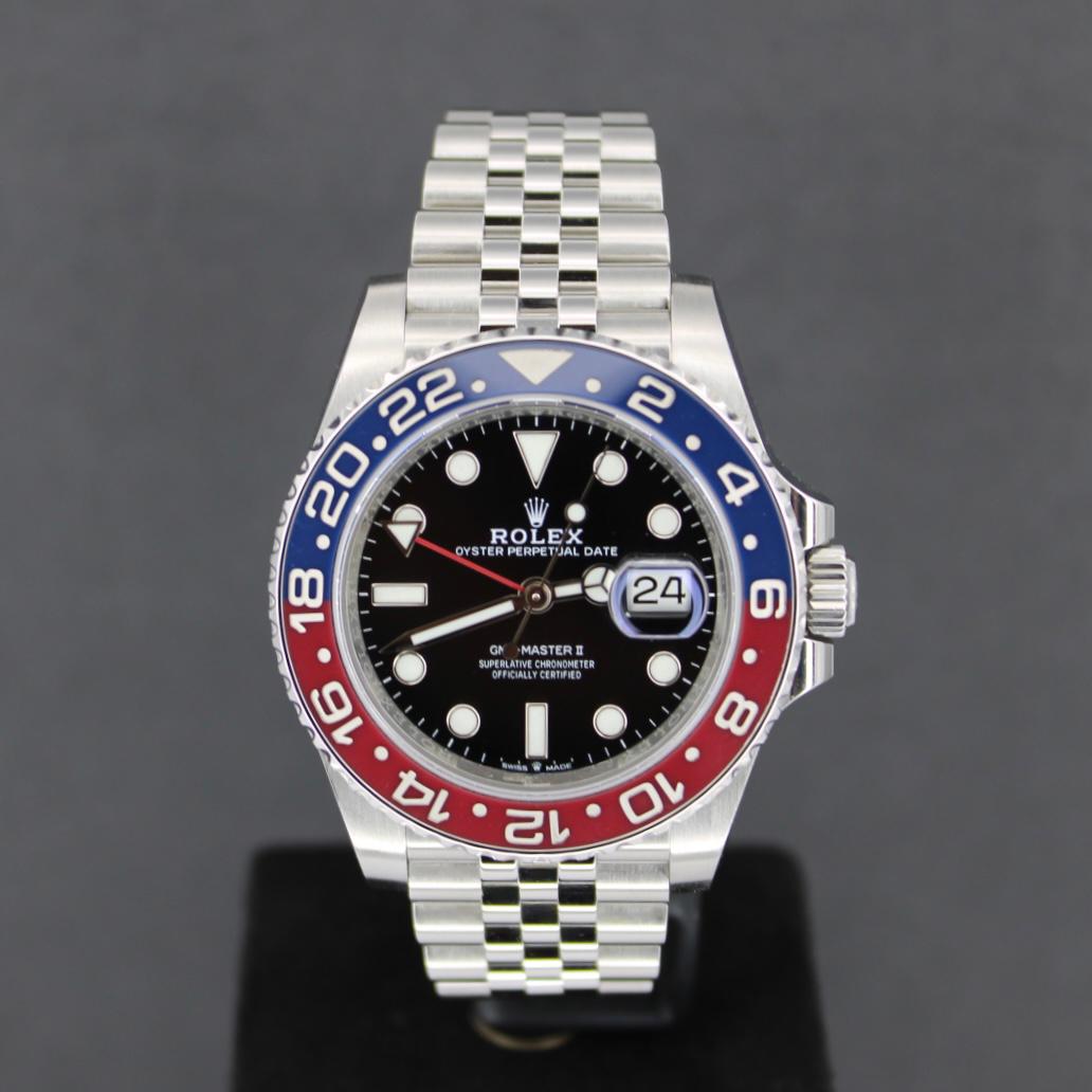The Rolex GMT-Master II reference 126710BLRO is an iconic sports watch that combines heritage design with cutting-edge performance. Crafted in Oystersteel, it features the instantly recognizable red and blue Cerachrom “Pepsi” bezel, allowing the wearer to track multiple time zones simultaneously. Fitted on a Jubilee bracelet, it offers both comfort and a refined aesthetic. The black dial, luminous hour markers, and Cyclops date window ensure excellent legibility, while the automatic Calibre 3285 provides outstanding precision and reliability. This model perfectly represents the timeless innovation and global spirit of Rolex.